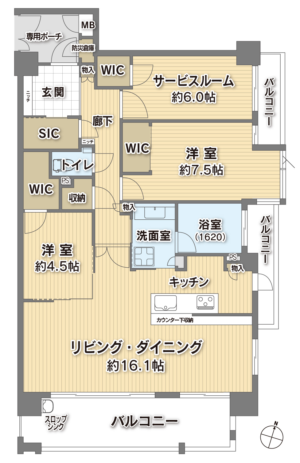 | 設備・サービス | 玄関:床タイル、オートライト 居室:ウォークインクロゼット、全室収納あり 収納:廊下収納 バルコニー:南向き、防災倉庫付、スロップシンク セキュリティ:24時間セキュリティ、エントランスオートロック、TVモニター付きオートロック |